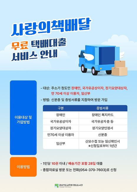 ‘사랑의책배달’은 원하는 도서를 무료로 집까지 배달해 주는 맞춤형 도서 대출 서비스로, 청도에 주소를 둔 장애인, 만 70세 이상 노인, 임산부, 국가유공상이자, 장기요양대상자를 대상으로 한다.