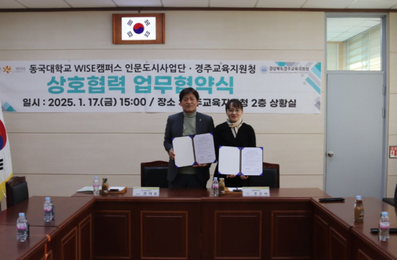 □ 경상북도경주교육지원청(교육장 권대훈)과 동국대학교WISE캠퍼스가 17일 경주교육지원청 상황실에서 경주교육지원청 권대훈 교육장, 동국대학교WISE캠퍼스 홍은숙 교수 등이 참석한 가운데 ‘경주 공감문화 상생플랫폼 도시’ 사업을 위한 업무협약’을 체결했다.