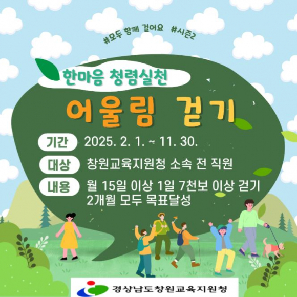 경상남도창원교육지원청(교육장 황흔귀)은 2월 1일(목)부터 전 직원이 함께 참여하는‘한마음 청렴실천 어울림 걷기’행사를 시작한다. 지난해 처음 시작된 이 행사는 전 직원들의 큰 호응을 얻으며 건강과 청렴을 동시에 실천하는 문화로 자리매김했다. 올해는 작년의 성공을 바탕으로 프로그램을 더욱 다양하게 구성하여 직원 건강증진과 화합을 적극적으로 도모할 예정이다.