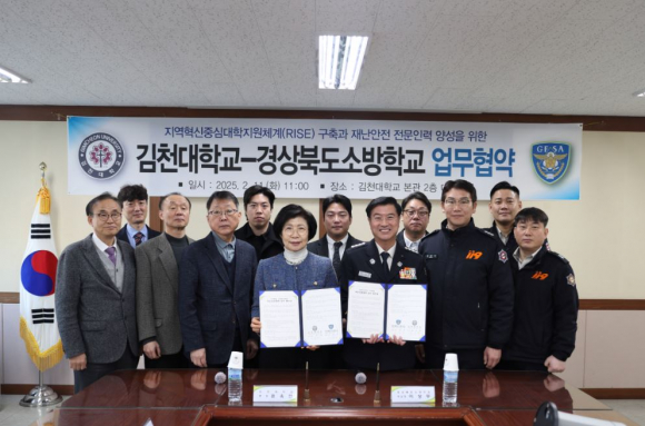 김천대학교(총장 윤옥현)와 경상북도소방학교(학교장 이상무)는 지역 혁신 중심대학 지원체계(RISE) 구축과 재난안전 전문 인력 양성을 위한 업무협약을 체결했다고 11일 밝혔다. 이번 협약을 통해 양 기관은 재난안전분야의 전문인재양성과 지역사회 안전 강화를 위한 협력을 본격화할 예정이다.
