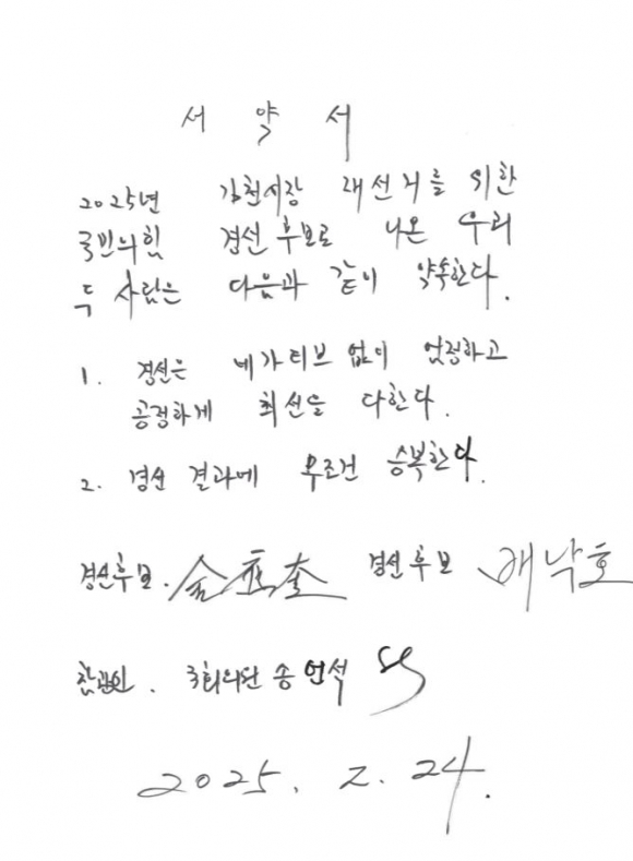 또, 이 자리에서는 김응규 후보와 배낙호 후보가 선의의 경쟁과 경선 결과 승복을 서약하는 서약서를 작성하는 시간을 가지기도 했다. 두 후보가 직접 서명한 서약서는 네거티브 없는 공정한 경선을 다짐하며, 경선 결과에 무조건적인 승복을 내용으로 하고 있다.