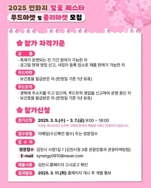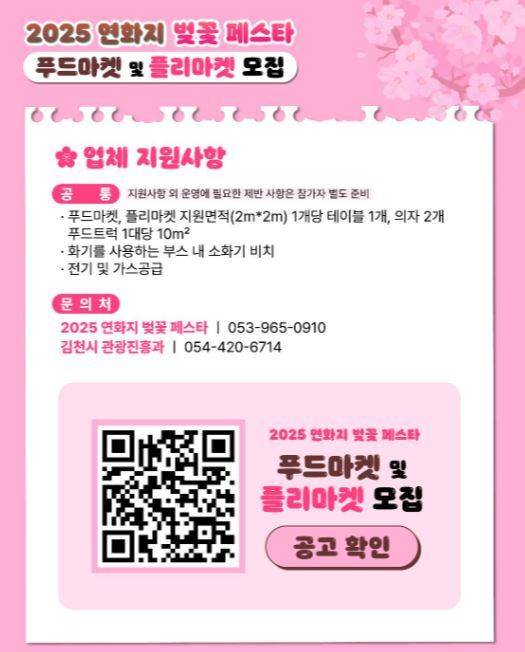 김천시는 3월 29(토)부터 4월 6일(일)까지 9일간 개최 예정인 『2025 연화지 벚꽃 페스타』푸드·플리마켓 참여업체를 3월 5일(수)부터 3월 7일(금)까지 모집한다고 밝혔다.