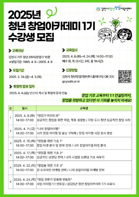 김천대학교(총장 윤옥현) 산학협력단(단장 윤경식)은 김천시 청년창업지원센터가 오는 4월 8일부터 운영 예정인 ‘2025년 청년 창업아카데미 1기’ 수강생을 적극 모집하고 있다고 19일 밝혔다.