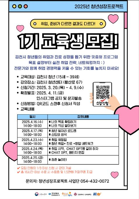 김천대학교(총장 윤옥현) 산학협력단(단장 윤경식)은 ‘2025년 청년성장프로젝트’ 취업 교육 프로그램 1기 교육생을 모집한다고 20일 밝혔다.