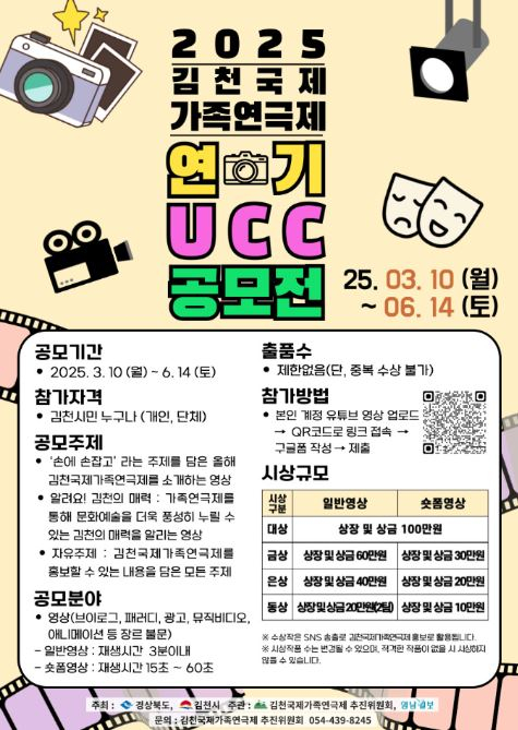 김천국제가족연극제 추진위원회(위원장 고인범)에서 주관하는 이번 공모전은 김천시민 누구나 개인 또는 단체로 참가할 수 있으며, 김천국제가족연극제 또는 김천을 알리는 영상이라는 주제로 일반 영상(재생시간 3분 이내), 숏폼 영상(재생시간 15초~ 60초 이내) 2부문으로 진행된다.