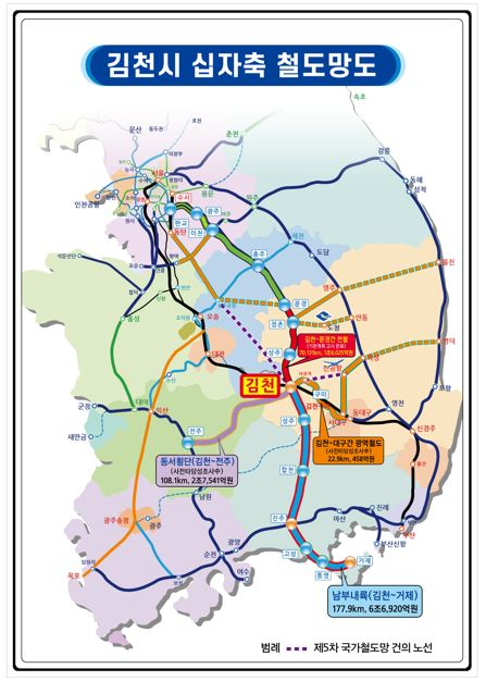 아울러, 김천시는 철도건설사업으로 중부내륙철도(김천~문경), 남부내륙철도(김천~거제) 사업과 더불어 제4차 철도망 구축계획에 포함되어 검토 중에 있는 대구권 광역철도 2단계(김천연장) 사업, 동서횡단철도(김천~전주) 건설사업의 추진을 위해 국회의원 및 관계 중앙부처, 기관 등과 긴밀한 협조 체계를 구축하여 조속히 추진될 수 있도록 최선의 노력을 다하고 있다.