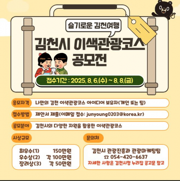 공모 주제는 ‘김천시의 관광 자원을 활용한 이색적인 관광코스’이며, 접수 기간은 8월 6일(수)부터 8일(금)까지 3일간이다. 제출 서류는 이메일로 접수하며, 김천의 자연, 역사, 문화, 먹거리 등을 창의적으로 조합한 이색 관광코스 아이디어 보유자는 누구나 참여 가능하다.