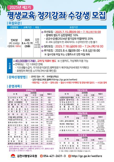 김천시 평생교육원은 7월 15일부터 8월 24일까지 「2025년 제2기 평생교육 정기강좌」 수강생을 모집한다고 밝혔다.