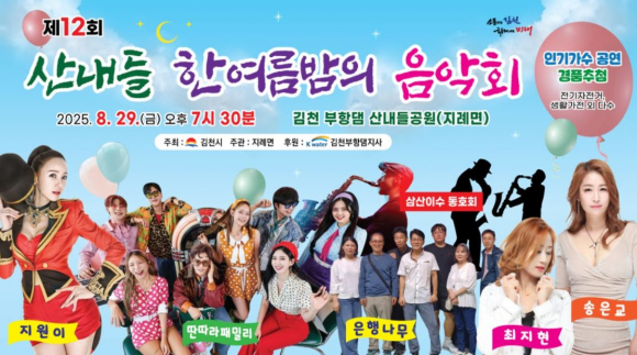 김천시가 주최하고 지례면과 지례면 주민자치위원회가 공동 주관하는「제12회 산내들 한여름 밤의 음악회」가 오는 8월 29일(금) 오후 7시 30분 산내들 공원 야외공연장에서 개최된다.