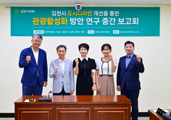 김천시의회(의장 나영민)‘김천 디자인UP 연구회(우지연·이승우·김세호·이상욱·윤영수 의원)’는 8월 28일 『김천시 도시디자인 개선을 통한 관광활성화 방안 연구』의 중간보고회를 개최했다. 이번 보고회에서 용역업체는 ▲공공디자인 진흥계획 및 가이드라인의 필요성 ▲국내외 공공디자인 우수사례 ▲김천시 공공디자인의 현황 및 문제점 등을 발표한 후, 아직까지 미흡한 김천시 공공디자인의 방향성에 대해 참여의원들과 함께 토의를 이어갔다.