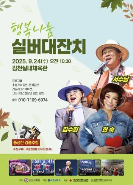 김천대학교(총장 윤옥현)는 오는 2025년 9월 24일(수) 오전 10시 30분, 김천실내체육관에서 지역 어르신 약 5,000여 명을 대상으로 ‘2025 행복나눔 실버 대잔치’를 개최한다고 밝혔다.