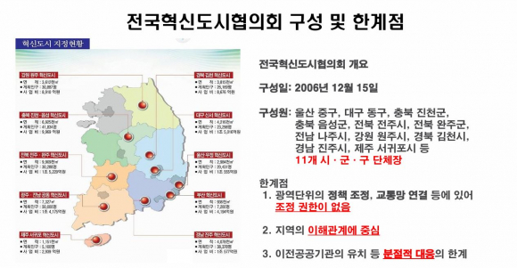혁신도시, 기초 협의체 한계 넘어 ‘광역 협의체’ 필요 조 의원은 먼저 김천 율곡동에 위치한 경북 혁신도시의 현황을 설명하며, 기존 기초자치단체 중심의 전국혁신도시협의회가 갖는 한계를 지적했다.
