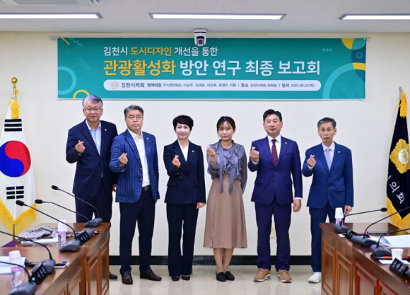 김천시의회(의장 나영민) 의원연구단체인‘김천 디자인UP 연구회(우지연·이승우·김세호·이상욱·윤영수 의원)’는 9월 25일 『김천시 도시디자인 개선을 통한 관광활성화 방안 연구』 최종보고회를 개최했다. 이번 보고회에서는 용역 수행기관이 중간보고 이후 보완된 연구결과를 발표하고, 김천시 공공디자인의 문제점과 개선방향을 제시하였다. 특히, 도시의 일관된 이미지 형성과 체계적인 사업 추진을 위해서는 공공디자인 진흥계획 수립이 반드시 필요하다는 점이 강조되었다.