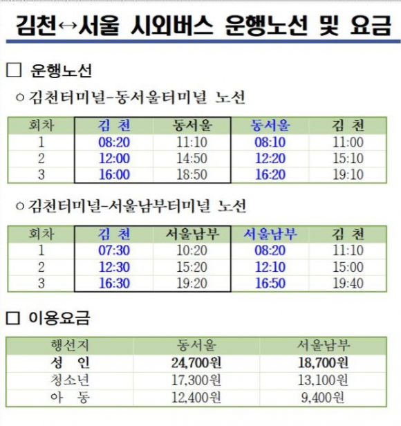 이번에 개통된 노선은 ▲김천↔동서울터미널 ▲김천↔서울남부터미널 등 2개 노선으로, 김천시민들의 교통 접근성과 이동 편의성이 크게 향상될 것으로 기대된다. 현재 하루 3회 왕복으로 운행 중이며, 향후 시민 이용 수요에 따라 운행 횟수를 점진적으로 확대할 예정이다.