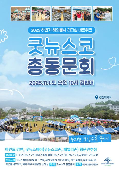 김천대학교(총장 윤옥현)는 오는 11월 1일(토) 제26회 굿뉴스코 총동문회가 개최된다고 밝혔다. 이번 행사는 해외봉사단원 출신 청년들이 한자리에 모여 봉사정신을 되새기고, 사회적 가치 확산과 글로벌 연대를 모색하기 위해 마련됐다.