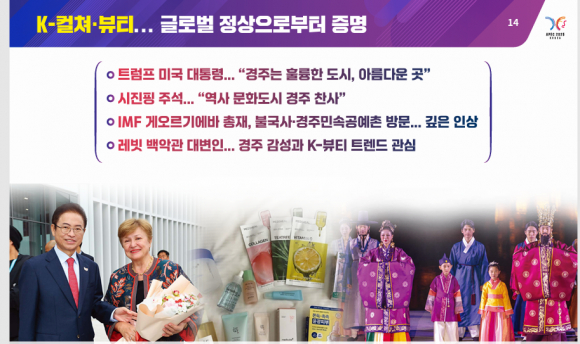 “K-컬쳐, K-뷰티로 상징되는 K-한류는 경북 경주의 문화 DNA에서 시작되었다”며 “이러한 문화 DNA에 첨단 기술을 접목한 다양한 콘텐츠를 통해 경북 경주를 더욱 더 매력적인 문화 도시로 만들어 가겠다”고 말하였다.