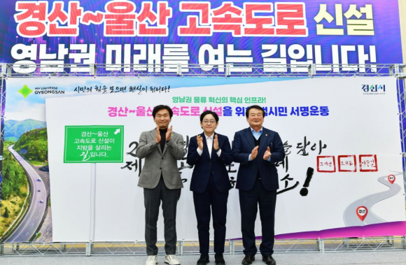 ■ 경산시·정치권“시민 의지, 국가 계획 반영 목표로 협력” 조지연 국회의원은 “경산과 울산을 잇는 직선 고속도로는 단순한 교통망 확충을 넘어 영남권 물류 혁신의 핵심 인프라이자, 미래 산업 지도를 바꾸는 전략적 대안”이라며 “제3차 고속도로 건설계획에 경산~울산 간 고속도로 건설이 반영될 수 있도록 국회 차원에서도 혼신의 노력을 다하겠다”고 말했다.또한 “지역 균형 발전 측면에서도 꼭 필요한 사업”이라며, “경산을 넘어 영남권의 도약을 위해 힘을 모아주시길 당부드린다”고 말했다. 조현일 경산시장은 “경산~울산 고속도로는 대구·경북과 울산을 하나의 경제·생활권으로 연결하는 국가적 프로젝트”라며, “기업 물류비 절감과 산업 경쟁력 강화가 절실한 지금 더 이상 미룰 수 없는 사업”이라고 강조했다. 이어 “10만 범시민 서명운동은 시민의 염원을 모아내는 과정인 만큼, 국토교통부에 간절한 시민의 뜻을 전달해 ‘제3차 고속도로 건설계획(2026~2030)’에 반영될 수 있도록 최선을 다하겠다”고 밝혔다.