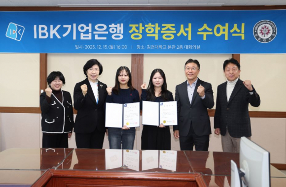 김천대학교(총장 윤옥현)에서는 15일 김천대학교 대회의실에서 IBK기업은행(김천지점장 정재원)이 지원하는 2025학년도 장학증서 수여식을 개최하고, 장학금을 수여했다.