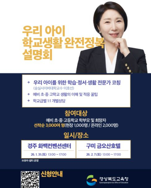 경북교육청(교육감 임종식)은 학교급 전환기를 앞둔 예비 초․중․고 학부모를 대상으로 ‘2026학년도 우리 아이 학교생활 완전 정복 설명회’를 오는 31일(경주 화백컨벤션센터)과 2월 7일(구미 금오산호텔), 두 차례에 걸쳐 개최한다고 19일 밝혔다.