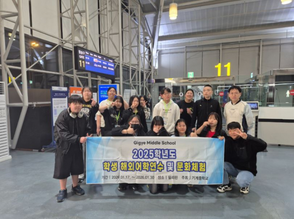 - 기계중학교(전교생 23명, 교장 이동훈)는 2026. 1. 17.(토) ~ 1. 30.(금)까지 13박 14일 일정으로 1,2학년중 희망학생 13명을 대상으로(분교포함) 필리핀 마닐라 현지의 해외 어학연수를 추진하였다.