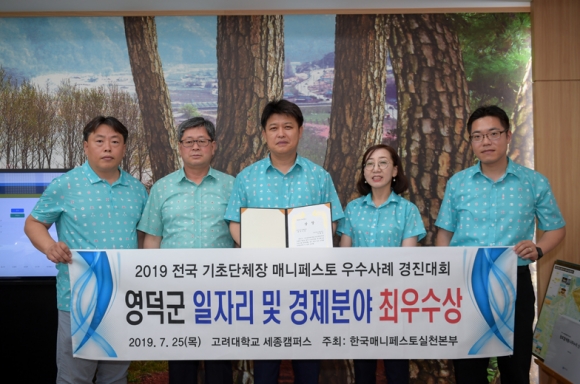 [밝은미래신문=뉴스팀]영덕군은 지난 24~25일 고려대 세종캠퍼스에서 열린 2019 전국 기초단체장 매니페스토 우수사례 경진대회‘에서 ’일자리 및 경제 분야 최우수상‘을 수상했다고 밝혔다.