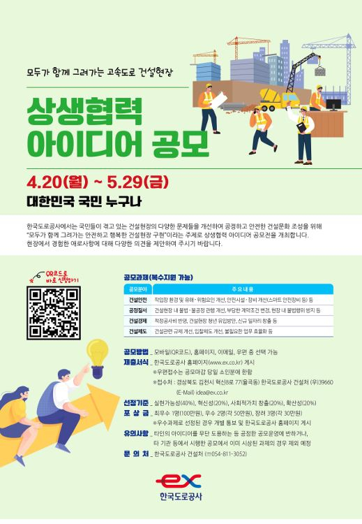 한국도로공사(사장 직무대행 이상재)는 건설 현장에서 발생하는 다양한 문제를 개선하기 위해 ‘고속도로 건설 현장 상생협력 아이디어’ 공모를 4월 20일(월)부터 5월 29일(금)까지 실시한다고 밝혔다.ㅇ 이번 공모는 건설 관련 종사자뿐만 아니라 대한민국 국민 누구나 참여할 수 있으며, 응모 분야는 △건설안전(작업장 환경 및 유해․위험요인 개선 등),△공정질서(건설 현장 내 불법․불공정 관행 개선 등), △건설경제(적정공사비 반영, 신규 일자리 창출 등), △건설제도(건설관련 규제 및 입찰제도 개선 등 건설산업 정책 전반 등) 4개 분야로, 중복 응모도 가능하다.ㅇ 지원 방법은 포스터의 QR코드를 통해 모바일로 제출할 수 있으며, 공사 홈페이지(http://www.ex.co.kr)에서 지원서를 내려받아 전자우편(idea@ex.co.kr)으로 제출하거나, 공지사항에 안내된 국민생각함을 통해서도 제출할 수 있다.- 1 ㅇ 접수된 아이디어는 심사를 거쳐 최우수 1건(상금 100만원), 우수 2건(각 50만원), 장려 3건(각 30만원)을 선정해 포상금을 지급할 예정이다.□ 한국도로공사는 이번 공모에서 선정된 아이디어 가운데 자체적으로 해결 가능한 사안은 제도 개선을 통해 신속히 추진하고, 자체 해결이 어려운 경우 국회·관련 협회 등과 협력해 국민이 체감할 수 있는 대책을 마련할 계획이다.□ 한편, ‘건설 현장 상생협력 아이디어 공모’는 2020년에도 실시하여,총 209건의 아이디어가 접수되었다. ‘조기 개통 구간 하자담보 책임기간 현실화*’, ‘현장별 안전 전담 감리원 신규(2인) 배치’ 등 다양한 제도 개선으로 현장에서 실질적인 변화를 이끌어냈다.* (기존) 최종 준공일 → (개선) 개통일 기준 하자담보책임기간 산정으로시공사의 하자부담완화□ 한국도로공사 관계자는 “이번 공모를 통해 건설 현장 곳곳에 숨어있는 문제들을 발견하고, 현장에서 일하는 분들이 체감할 수 있는 개선책을 마련하겠다”며, “앞으로도 현장의 목소리에 귀를 기울여 더 안전하고 공정한 건설 문화를 만들어 나가겠다”고 말했다 |