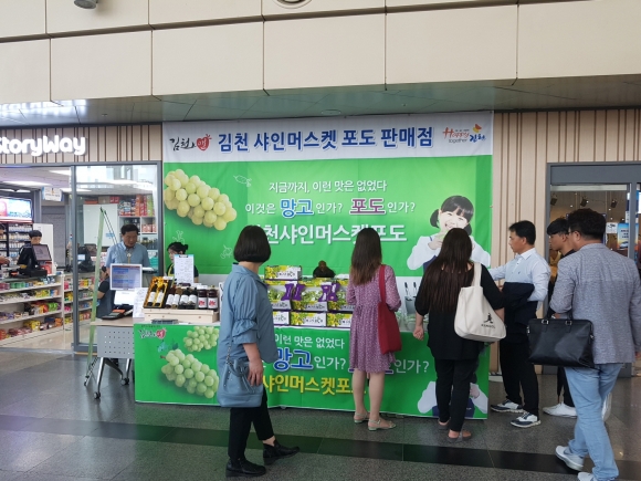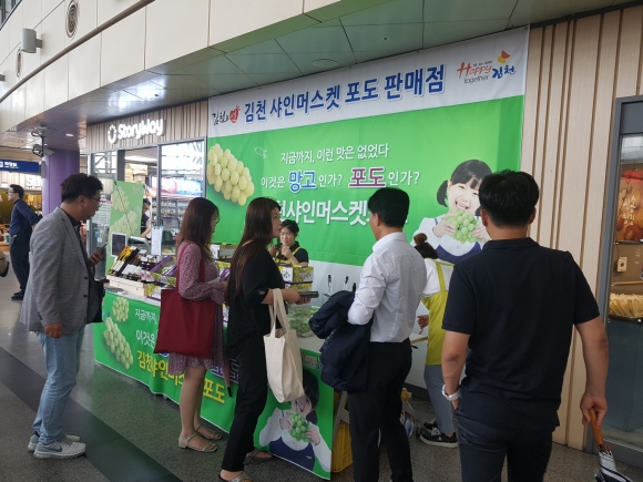 김천시(시장 김충섭)는 9월 6일부터 11일간 동대구역 주출입구에 김천시 독자적으로 김천농산물 판매장을 운영하여 귀성객과 도시민의 입맛을 사로잡을 샤인머스켓포도를 전략적으로 판매한다고 밝혔다.