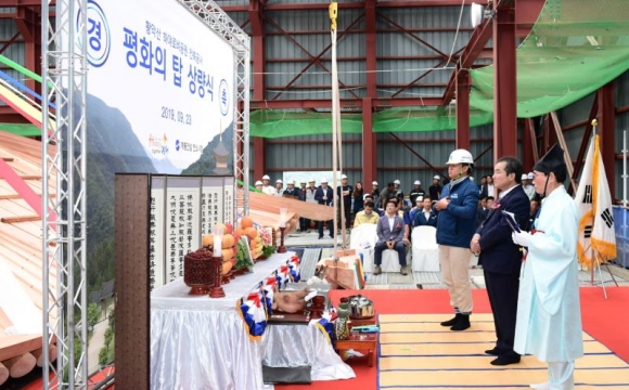 김천시(시장 김충섭)는 9월 23일(월) 하야로비공원내 평화의 탑 5층에서 지역 시의원 및 공사 관계자 등이 참석한 가운데 건축물의 준공까지 사업의 원활한 추진과 안전시공을 기원하는 상량식을 거행하였다.