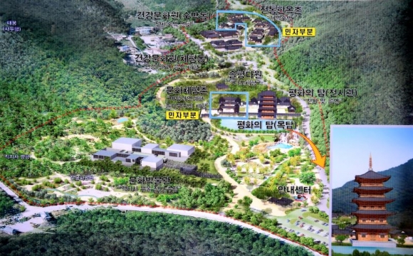 평화의 탑은 441㎡ 규모에 정면 3칸, 측면 3칸, 전체높이 41.5m의 5층 목탑으로 하야로비공원의 랜드마크로서 오는 12월말 완공 예정이다.
