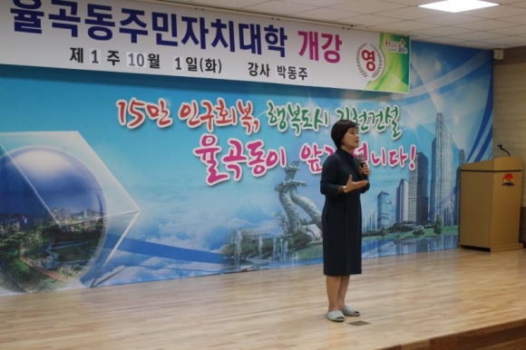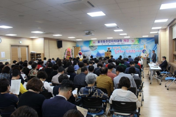 율곡동(동장 신장호) 주민자치위원회는 지난 10월 1일, 오후 7시에 율곡동 주민센터 2층 회의실에서 주민자치대학 개강식 및 첫 강의를 가졌다고 밝혔다. 율곡동 주민자치대학은 2019년도 경상북도 주민자치활성화 공모사업에 선정된 사업으로 지난 10월 1일부터 12월 17일까지 10주간 운영되며, Happy together 김천운동’ 전문 강사를 비롯한 다양한 분야의 저명 강사10명이 매주 다른 주제를 가지고 강의를 진행하게 된다. 동 주민자치위원회는 지난 9월 11일부터 9월 25일까지 137명의 수강 신청자를 모집하였고, 개강 첫 날인 10월 1일에는 현장 접수자를 포함 140명이 넘는 주민이 참석하여 주민센터 회의실에 비치된 의자가 모자랄 정도로 문전성시를 이루었다.