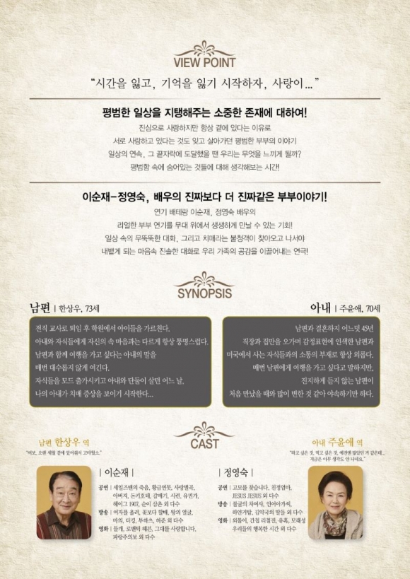 이번 공연은 평범한 일상 속에서 아내의 치매를 계기로 잊고 있었던 부부의 사랑과 가족의 소중함을 일깨워주고 아내의 기억이 지워진 자리를 남편의 사랑으로 보듬는 아름다운 노부부의 사랑 이야기로 공연장을 찾은 관객들에게 따스한 감동을 선사할 예정이다. 공연시간은 약 100분 정도이며, 초등학생이상 관람이 가능하다. 공연 관람료는 전석 1만원이며 유료회원은 30% 할인 된 가격에 구매할 수 있다. 또한, 관람권 구입은 10월 23일(수) 오후 2시부터 문화예술회관 홈페이지(www.gcart.go.kr) 등을 통하여 예매할 수 있다. 문의) ☎ 054-420-7824, 홈페이지 http://www.gcart.go.kr |
