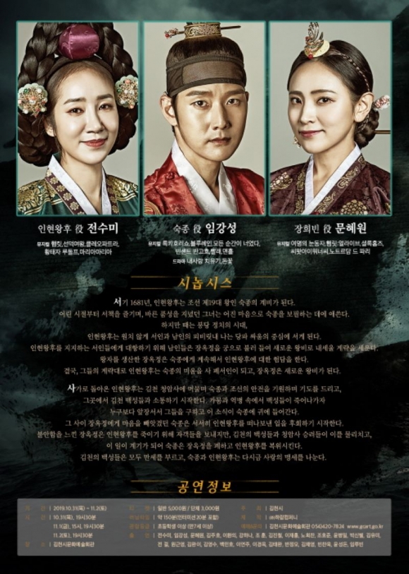 김천시문화예술회관(관장 김금숙)에서는 10월 31일(목)부터 11월 2일 (토)까지 문화예술회관 대공연장에서 창작 뮤지컬 『인현왕후』를 공연한다.