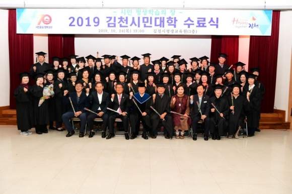 김천시(시장 김충섭)는 지난 10월 24일(목) 김천시평생교육원 3층 강당에서 김충섭 김천시장, 김세운 김천시의회의장, 내빈 및 수료생이 참석한 가운데 “2019 김천시민대학”수료식을 개최했다.