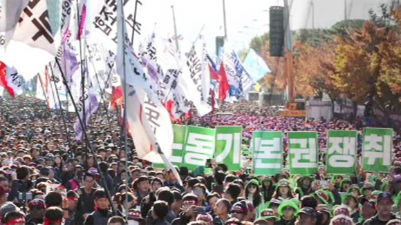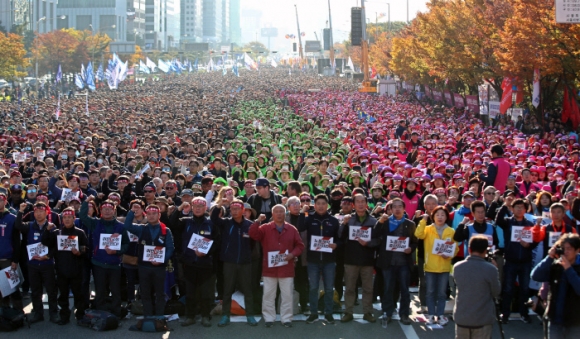 9일 오후 서울 영등포구 여의도 마포대교 남단 여의대로에서 열린 전태일 열사 정신 계승 전국노동자대회에서 전국민주노동조합총연맹(민주노총) 조합원들이 임을 위한 행진곡을 부르고 있다.