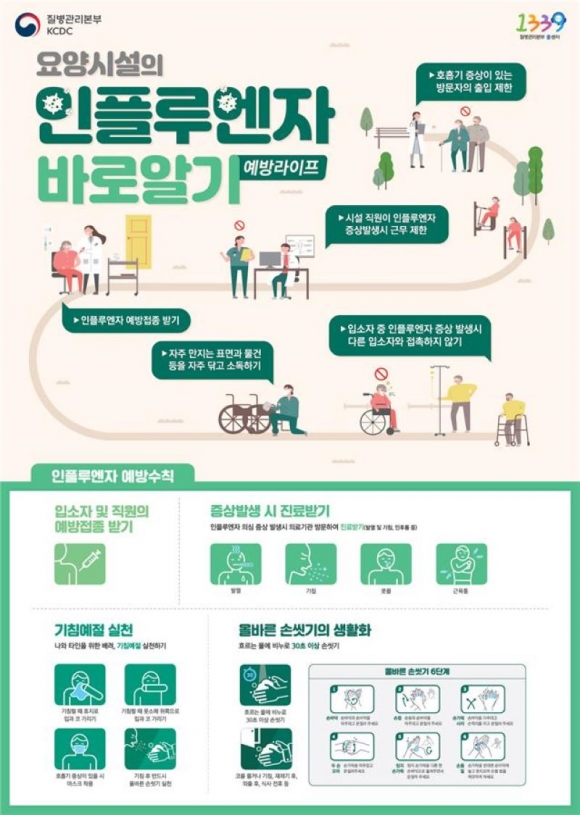노인요양시설 등 고위험군이 집단 생활하는 시설에서는 입소자에게 예방접종을 실시하고, 입소자의 인플루엔자 증상 모니터링을 강화하며, 호흡기 증상이 있는 방문객의 방문을 제한하고, 증상자는 별도로 분리하여 생활하도록 해야 한다.