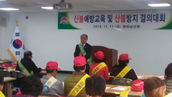 김천시 평화남산동(동장 서범석)은 15일 오후 주민센터 2층 회의실에서 관내 통장, 조직단체장, 주민, 공무원 등 130명이 참석한 가운데 산불예방교육 및 산불방지 결의대회를 개최했다.