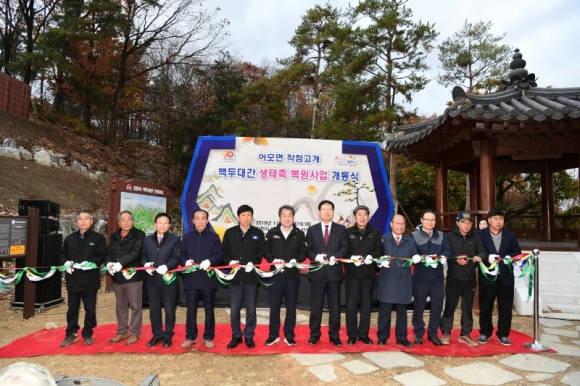 김충섭 김천시장은 인사말을 통해 “군도 개설로 인하여 단절되었던 백두대간의 생태축과 고립된 생태계가 이번 생태통로 연결로 김천의 역사와 정신을 이어갈 수 있도록 할 것이며, 김천시 발전의 또 다른 시작이라는 의미를 가지게 되었다.”며 “어모면 능치리의 생태축 복원은 우리 김천을 더욱 아름다운 도시로 성장할 수 있게 도울 것이고, 주변의 멋진 자연환경과 쉼터는 시민들의 휴식공간으로 탈바꿈 하게 될 것이다.”고 전하였다. |
