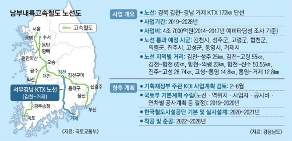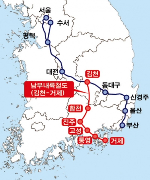 국토교통부는 20일 예비타당성조사 면제 5개 철도건설사업에 대한 기본계획수립에 본격 착수한다고 밝혔다. 국토 균형발전의 초석 마련 차원에서 추진되는 남부내륙철도, 평택~오송 2복선화 등 5개 철도건설사업이 본궤도에 올랐다. 남부내륙철도 건설은 서울과 수도권에서부터 KTX, 또는 SRT를 이용해 진주를 거쳐 거제까지 2시간 40분대에 도달할 수 있도록 하는 사업이다.