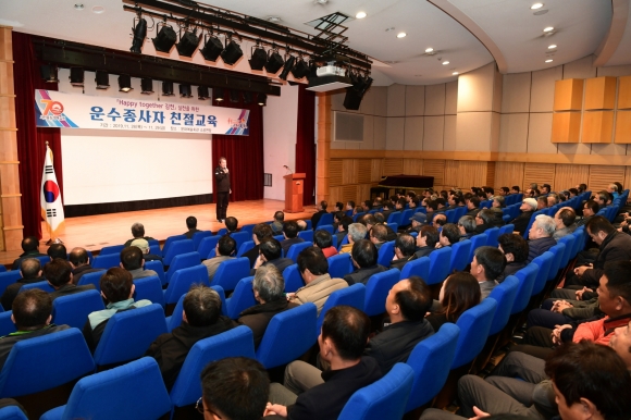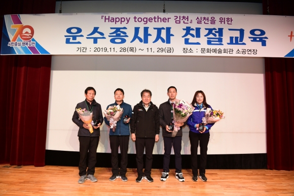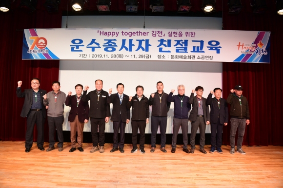 김천시(시장 김충섭)는 11.28(목)~11.29(금) 양일간 「Happy together」김천 운동 실천을 위하여 버스 및 택시업계 종사자 600명을 대상으로 친절 교육을 문화예술회관 소공연장에서 실시하였다. 민선 7기 출범 및 시 승격 70주년을 맞아 시정목표인 “시민 모두가 행복한 김천”의 최우선과제인 전시민의 친절 생활화와 시민의식개혁을 위한 「Happy together」김천 운동과 관련하여 링타이 착용식을 하여 버스와 택시업계 운수종사자가 솔선수범하여 실천하겠다는 결의를 하였고 동시에 친절봉사 서비스 및 교통법규 준수 교육을 가졌다.