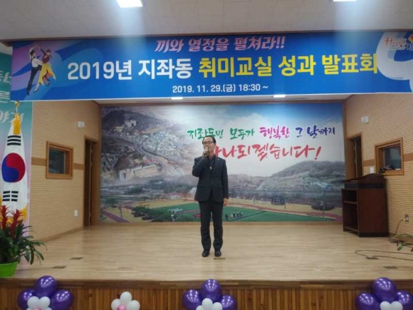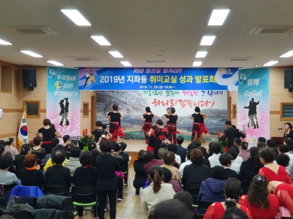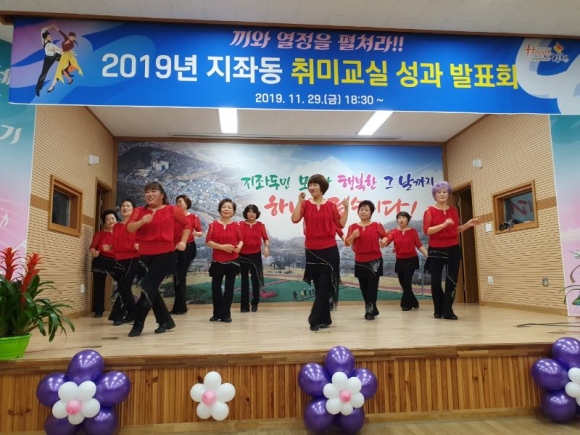 지좌동(동장 김영기)은 지난 29일(금) 3층 강당에서 회원 및 가족 등 200여명이 참석한 가운데 취미교실 성과 발표회를 성공적으로 개최했다. 이날은 라인댄스, 댄스스포츠, 한국무용, 노래교실, 캘리그라피 등 총 8개 프로그램의 회원들이 1년 동안 배우고 익힌 기량을 마음껏 펼친 의미 있는 자리였다.
