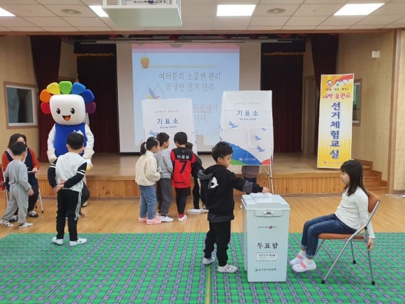 □ 선거체험교실 활동 당일에는 3층 율곡관으로 모여 민주주의의 의미, 민주시민의 책임과 역할, 투표하는 방법 등에 대하여 함께 이야기를 나누는 시간을 가졌다. 선거관리위원회 캐릭터 인형인‘참참이’도 등장하여 유아들의 흥미를 끌었고 함께 사진촬영도 하였다. 모의투표 체험을 위해 유아들은 기표소 안에 들어가 투표용지에 도장을 직접 찍어 보았다. 또한, 투표함 속에 넣었던 투표용지를 직접 개표해 보는 시간을 가졌다.