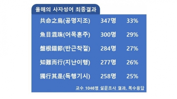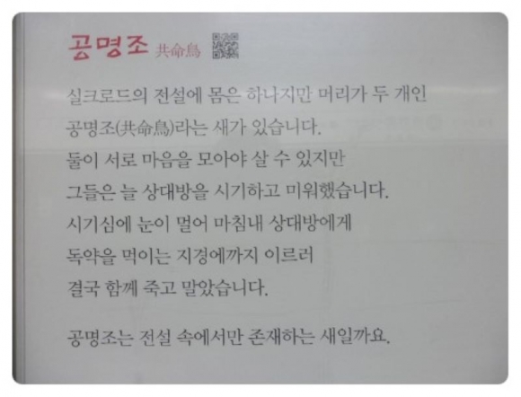 한 몸에 두 개의 머리를 가진 새로 어는 한쪽이 없어지면 자기만 살 것 같이 생각하지만 그러다간 모두 죽고 만다는 뜻의 공명지조 가 올해의 사자성어로 선정됐다 정치권이 서로 나뉘어 싸우는 것을 넘어 국민들까지 편싸움에 동조해 분열하고 있는 현실에 대한 안타까움을 담고 있다