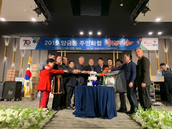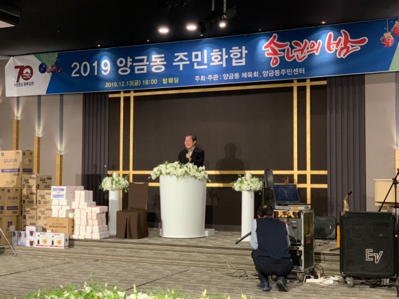양금동체육회(회장 윤기수)는 12월 13일 탑웨딩에서 양금동 기관·단체·주민200여명이 모인 가운데 ‘양금동 주민화합 송년의 밤’을 개최했다. 양금동 주민화합 송년의 밤은 양금동을 위해 애써주신 기관·단체·주민 들을 격려하고, 모두가 한자리에 모이는 뜻깊은 자리를 통해 양금동 주민들의 상호 협력과 화합을 이끌어내고 한해를 화합의 장으로 마무리하고자 개최하게 되었다.