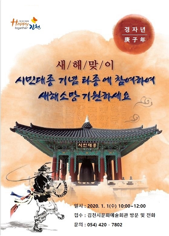 김천시는 2020년 경자년 새해 첫날(1월 1일) 시민들이 한해의 소망과 기원을 담아 자율타종 할 수 있도록 10:00∼12:00까지 김천 시민대종을 개방하여 시민들의 힘찬 출발을 응원한다. 김천시민대종은 김천의 힘찬 기상과 무궁한 번영을 기원하는 염원과 정성을 담은 시민들의 순수한 성금으로 1999년 10월 15일, 5천관(18.75톤)의 무게로 제작되어 김천시의 위상을 보여주는 상징물이다.