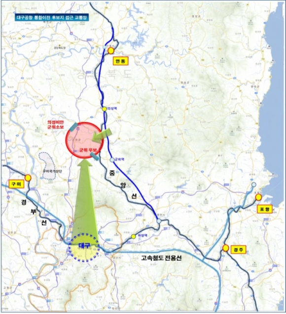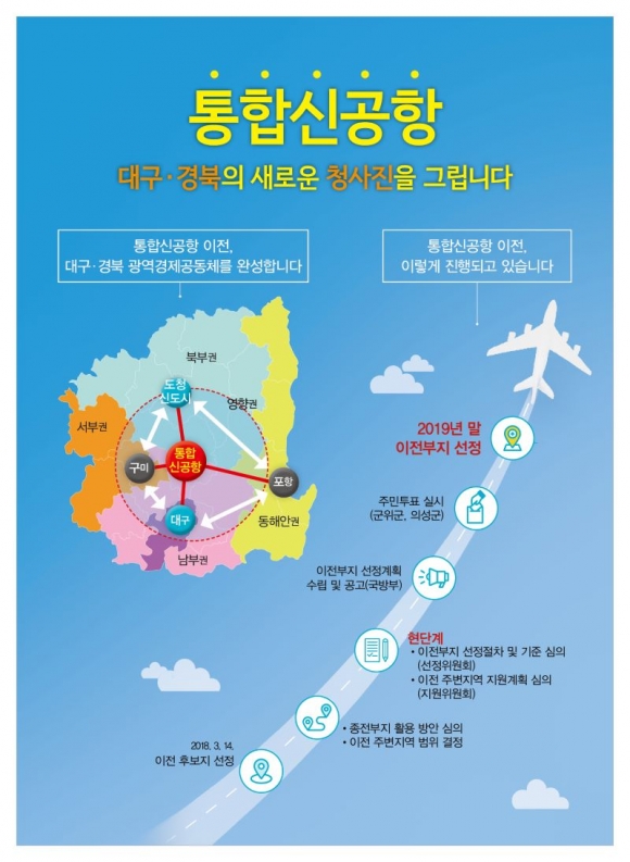 *선정위원회 : 국방부장관(위원장), 관계 차관·지자체장, 민간위촉위원 등 19명 *지원위원회 : 국무조정실장(위원장), 관계 차관·지자체장, 민간위촉위원 등 22명 「대구 군 공항 이전후보지」는 ‘경상북도 군위군 우보면 일대’와 ‘경상북도 의성군 비안면 및 군위군 소보면 일대’이며, '18.3.14. 선정위원회에서 선정했다.
