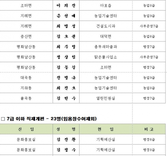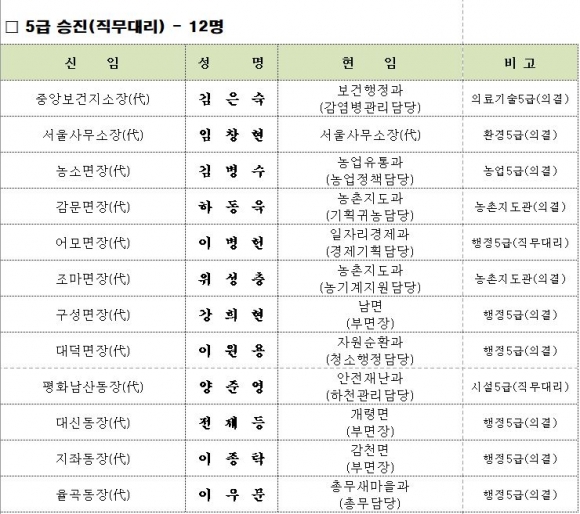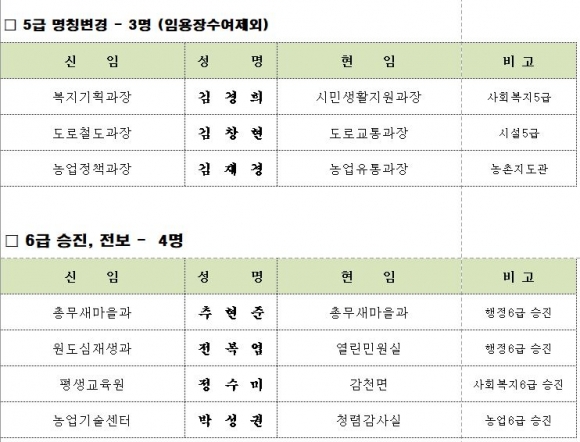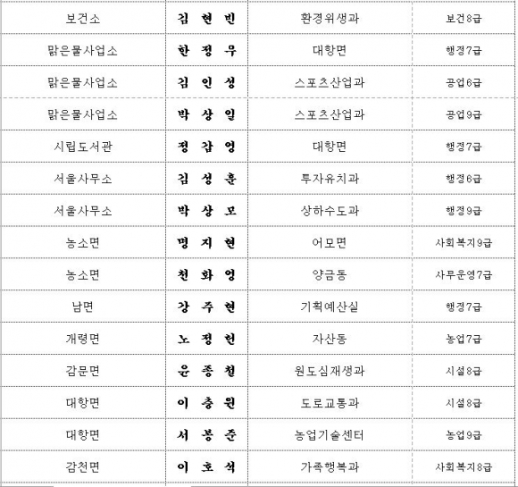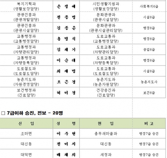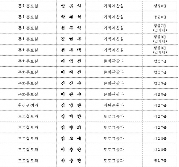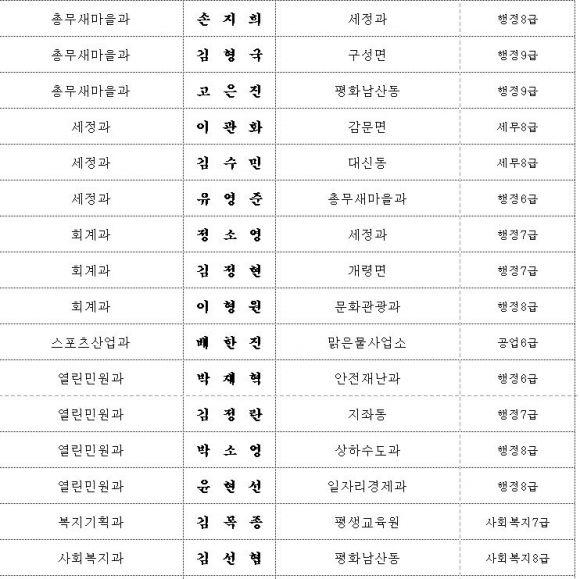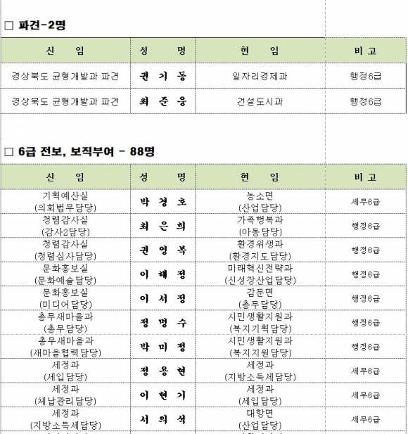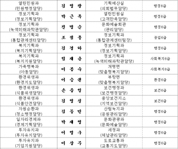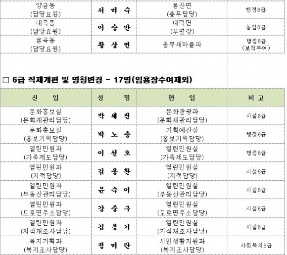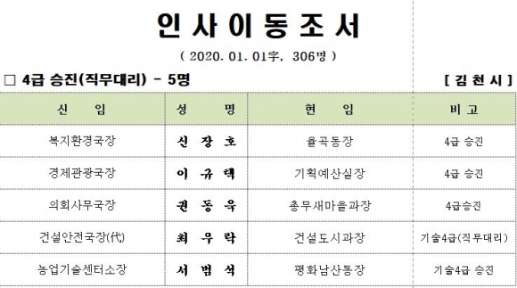 김천시 인사이동 조서 2020년 01월01 일자