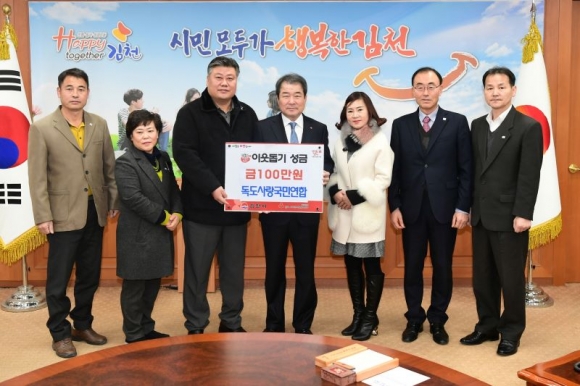17일 진행된 성금전달식에서는 독도사랑국민연합(회장 김종철)에서 100만원을 전달하여 김천시민들의 따뜻한 마음을 전했다.
