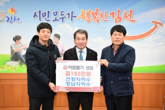 지난 16일에는 직지사상가번영회 (회장 장진환)에서 500만원을 기탁하고, 같은 날 건창지하수(대표 김명술)·영남지하수(강경대)에서 150만원, 평화동교회(목사 김명섭)에서 100만원을 전달하는 등 불경기가 지속되고 해가 바뀌는 중에도 온정의 손길이 이어져 훈훈함을 더하고 있다.