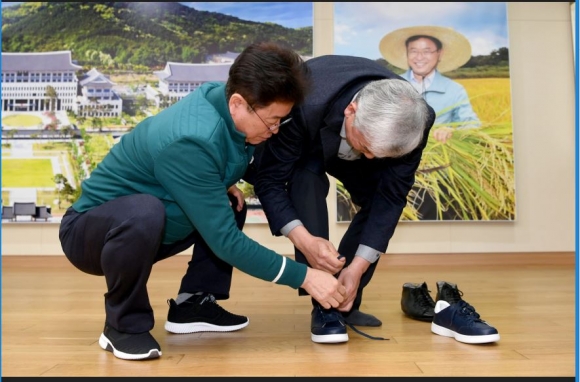 이철우 경상북도지사가 22일 도청 접견실에서 권오열 경북도 재정실장에게 운동화와 점퍼를 깜짝 선물했다. 이날 선물은 이 지사가 지난 한해 동안 국회와 세종에 상주하면서 지역현안사업의 정부예산안 반영을 위해 기재부 등 중앙부처 공무원을 매일 만나 설득하는 등 끈질긴 노력으로 국가투자예산 확보에 큰 성과를 거둔 권오열 재정실장의 노고를 격려하고자 특별히 마련한 것이다. 민선7기 출범 무렵 지속적으로 감소하는 경북도의 국비규모와 향후 국비예산 확보에도 상당한 어려움이 예상되는 가운데 기재부 및 국회 예산심의 과정에서의 선제적, 전문적인 대응이 절대적으로 필요하다고 판단한 이철우 지사가 취임한 후 전격적으로 임명한 권오열 재정실장은 풍부한 실무경험과 두터운 인적네트워크를 통하여 계속해서 줄어드는 도 국가지원예산을 2년 연속 증액 확보하는 성과를 이뤄냈다.