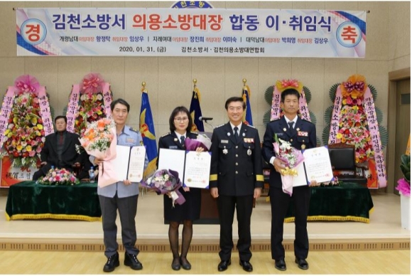 김천소방서(서장 이상무)는 2020년 1. 31.(금) 오후 2시 김천소방서 2층 대회의실에서 의용소방대장 합동 이·취임식 행사를 가졌다고 밝혔다. 이날 행사에는 이임하는 전임대장 (황정탁 개령남성의용소방대장, 장진희 지례여성의용소방대장, 박희영 대덕남성의용소방대장)에게는